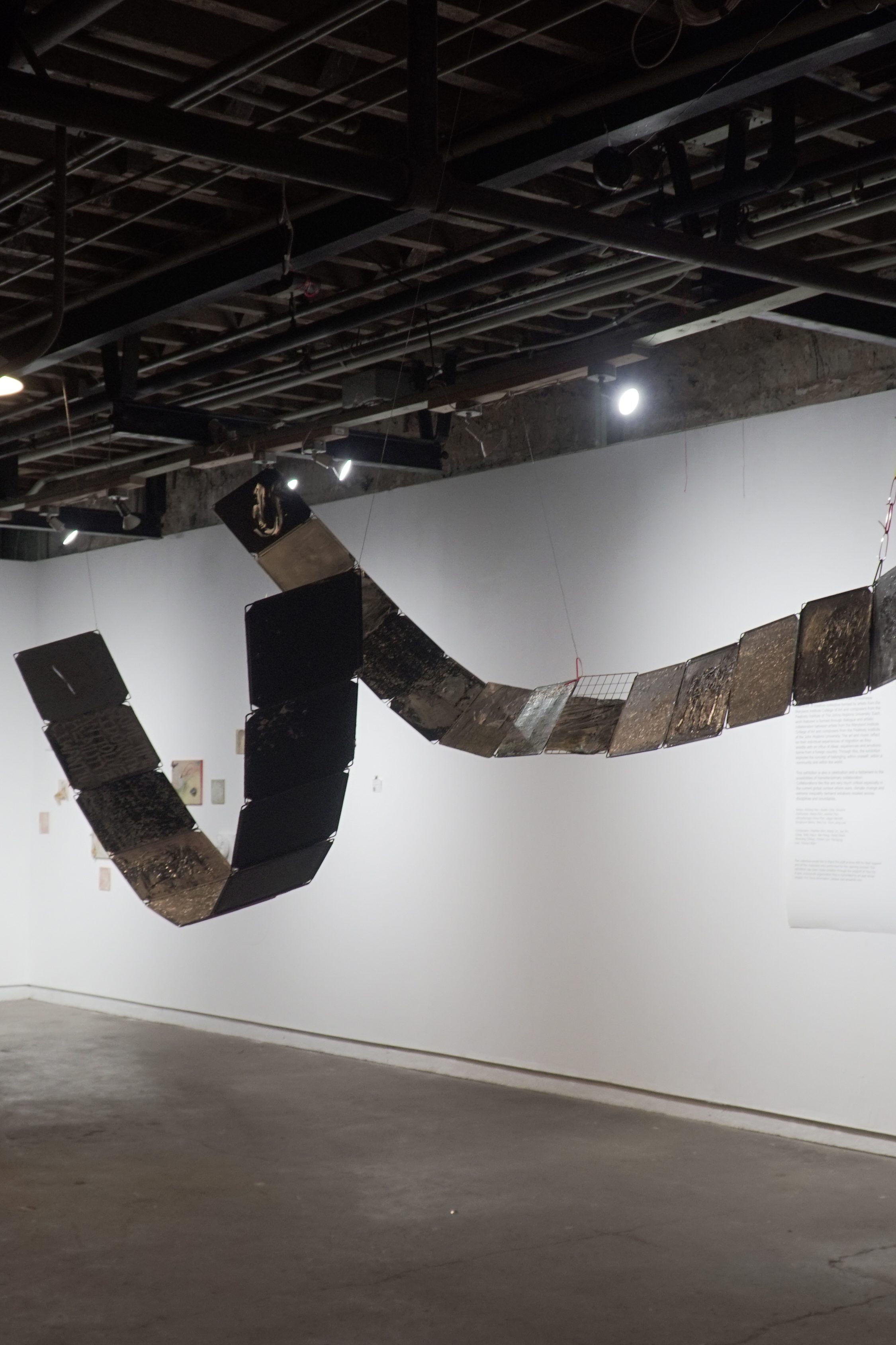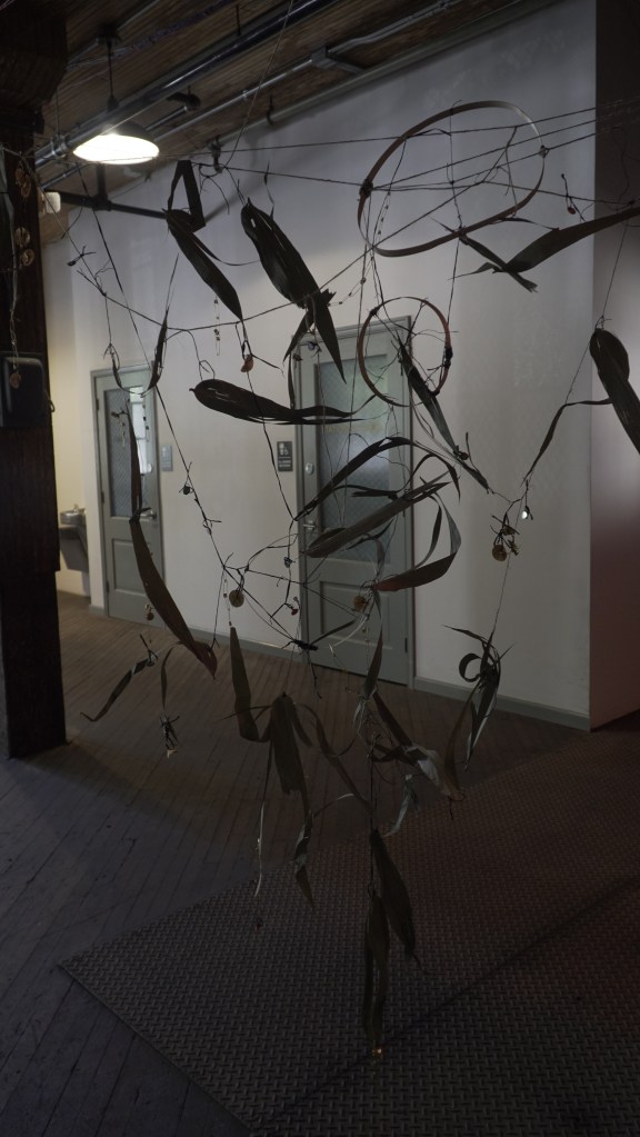 Here the myth is Asian identity. The longer sāgar lives in the diaspora, the more that an Indian or Asian identity feels like a constructed fiction. This sculpture pulls together various diasporic, liminal, and domestic materials like the bamboo leaf, safety pins, mirror and gold sequins used in decor or costuming, and twines. The process of building was improvisational, a constant search for where each fits in and the resulting sprawling shape captures the fluidity and and dynamic nature of who we are and who we become based on context and environment rather than solely the identity from which we are born. The materials each have migrated to Baltimore from various homes and have learned to understand each other, the space, and that larger context they exist in. Heather has created a blossoming soundscape using elements of Korean poetry, Kathak bols (percussive North Indian Compositions), sounds of nature, and a vibraphone to evoke the feeling of spring. The feeling of searching, yearning, and blossoming into a new season of growth and exploration compliments the materials used in the sculpture. Together, Heather and sāgar aimed to create an experience of finding and losing oneself.