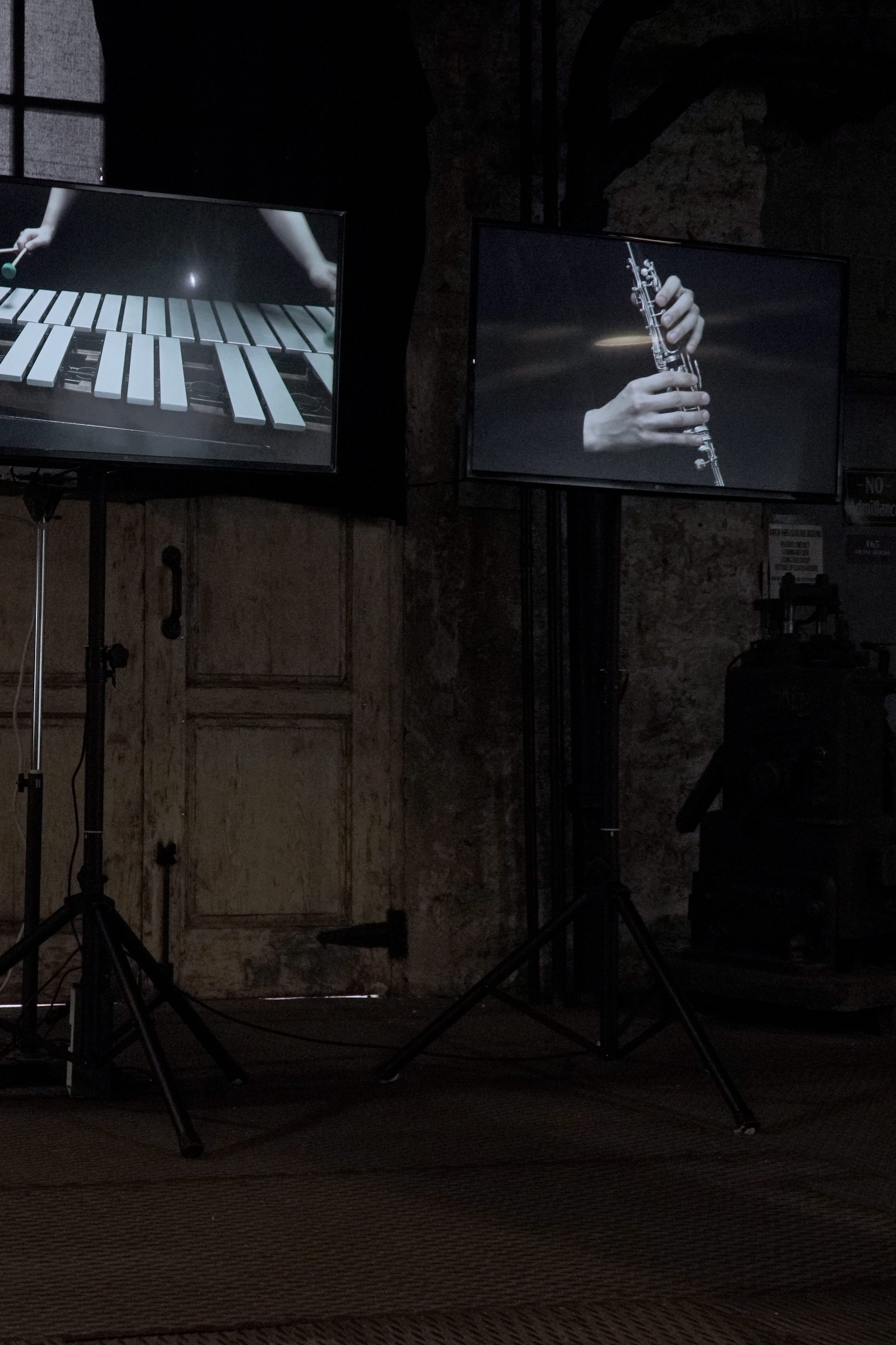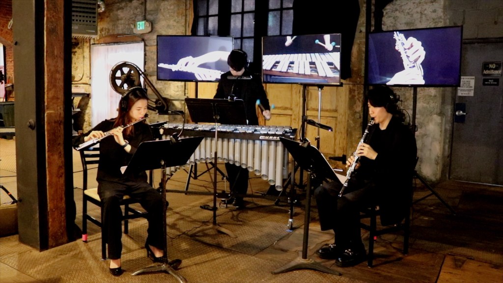 The trio of flute, clarinet, and vibraphone represent the ‘performers,’ each adhering to fixed gestures. When the camera’s gaze is present, they not only maintain these gestures but also experiment with different sounds using techniques like harmonics, articulation and fingering similarity. Conversely, when not in the camera’s gaze, the instruments break free, exploring a wider range of sonic possibilities.
